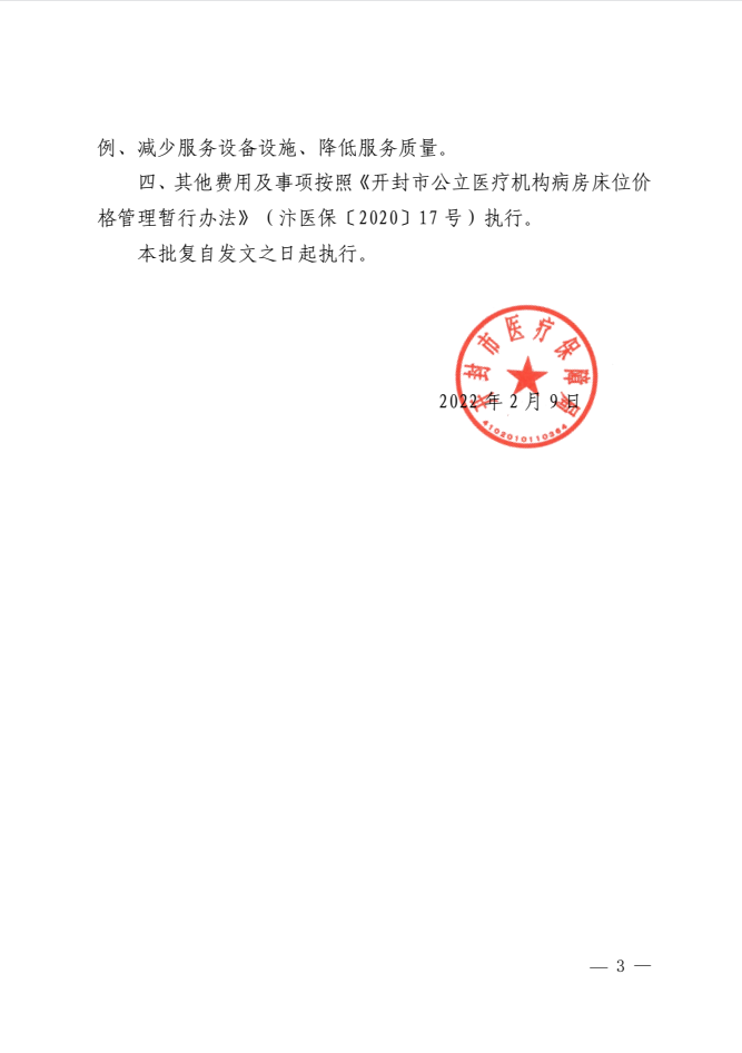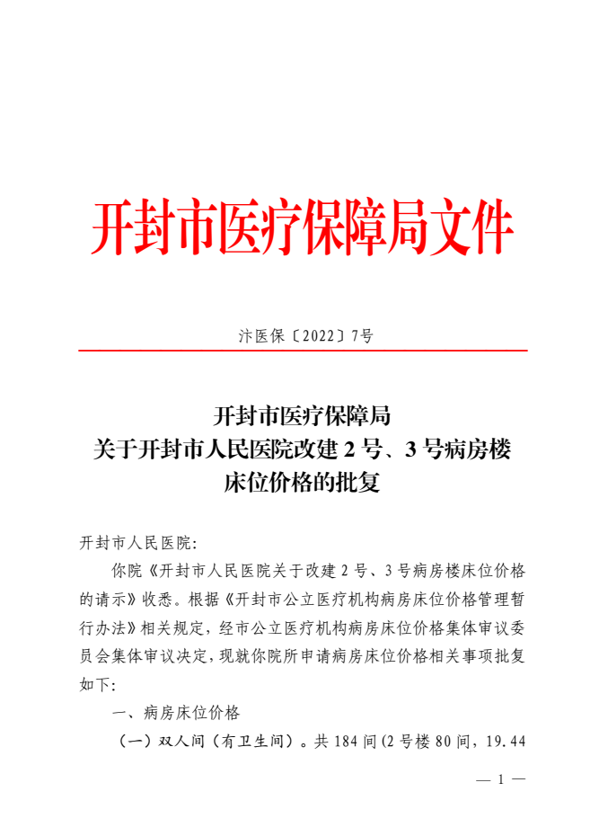 開封市醫(yī)療保障局關于開封市人民醫(yī)院改建2號、3號病房樓床位價格批復