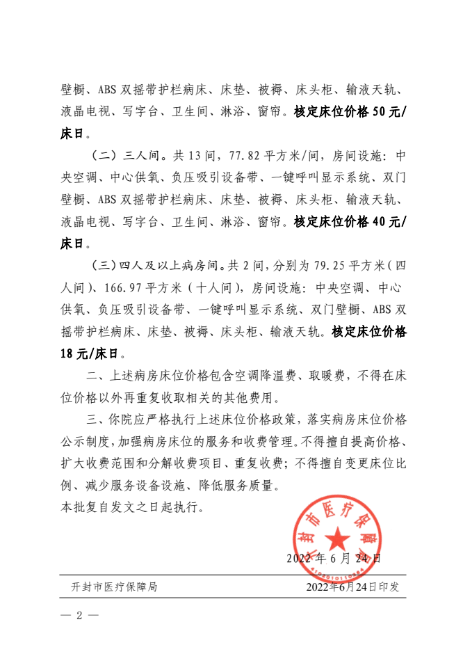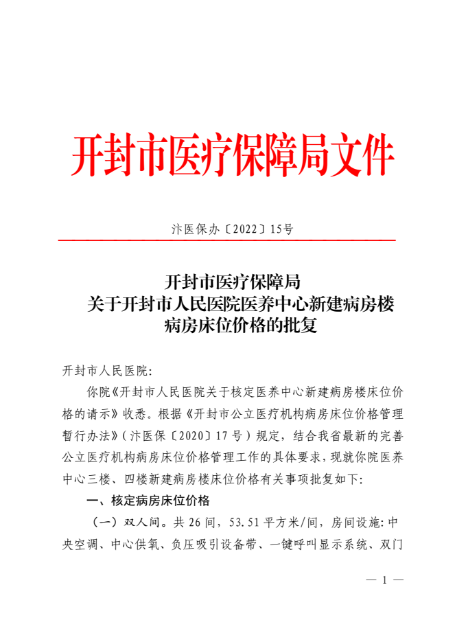 開(kāi)封市醫(yī)療保障局 關(guān)于開(kāi)封市人民醫(yī)院醫(yī)養(yǎng)中心新建病房樓 病房床位價(jià)格的批復(fù)