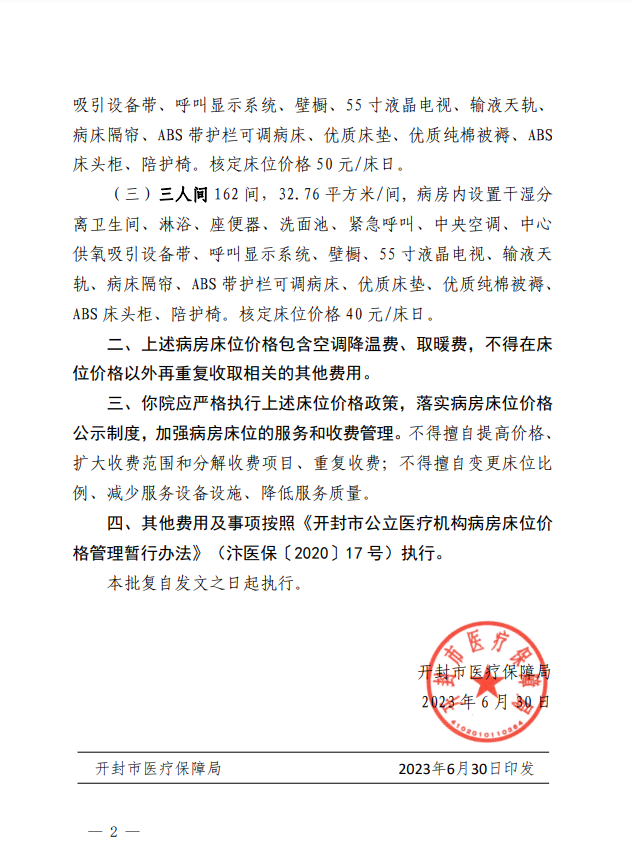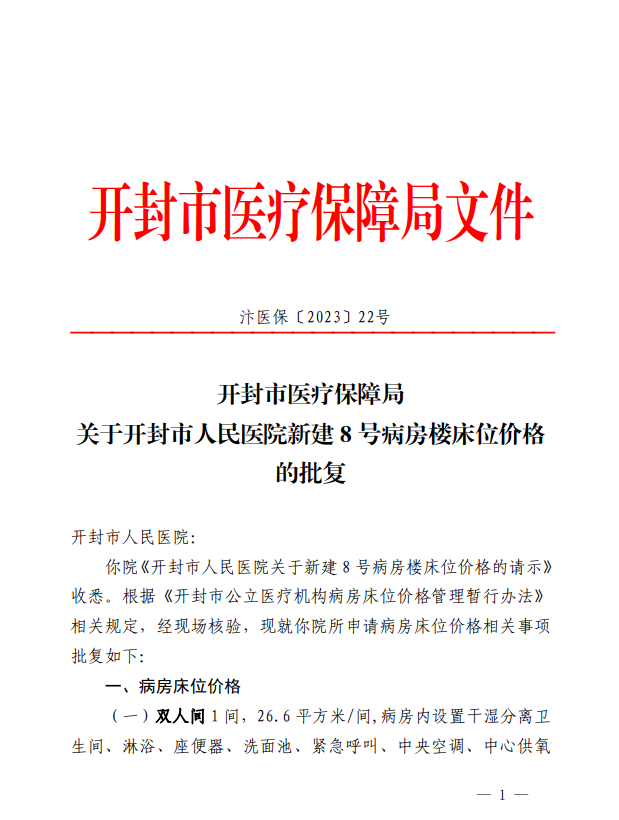 開封市醫(yī)療保障局關(guān)于開封市人民醫(yī)院新建8號(hào)病房樓床位價(jià)格的批復(fù)