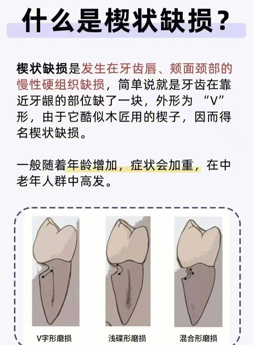 最常見的是楔狀缺損。多為發生在牙頸部的硬組織缺損。其原因多為機械摩擦(錯誤刷牙方法)酸蝕及應力集中因素導致,因口大底小形似楔子,故得名。