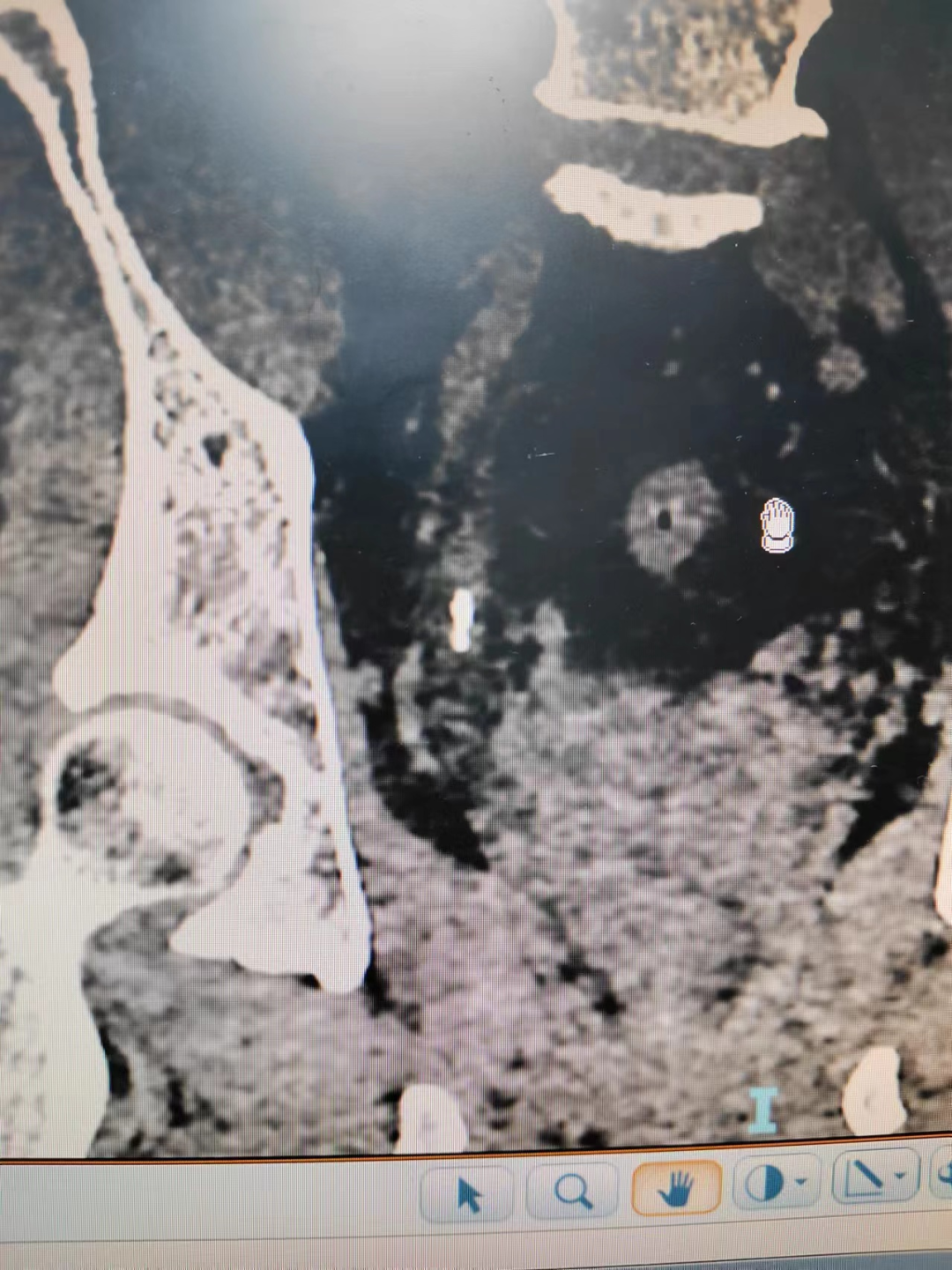 接診以后,立刻安排患者進行CT檢查,發現岳先生的結石是多個結石掉落在輸尿管內,形成“石街”。造成泌尿系統完全性梗阻,患者肌酐已經升高。